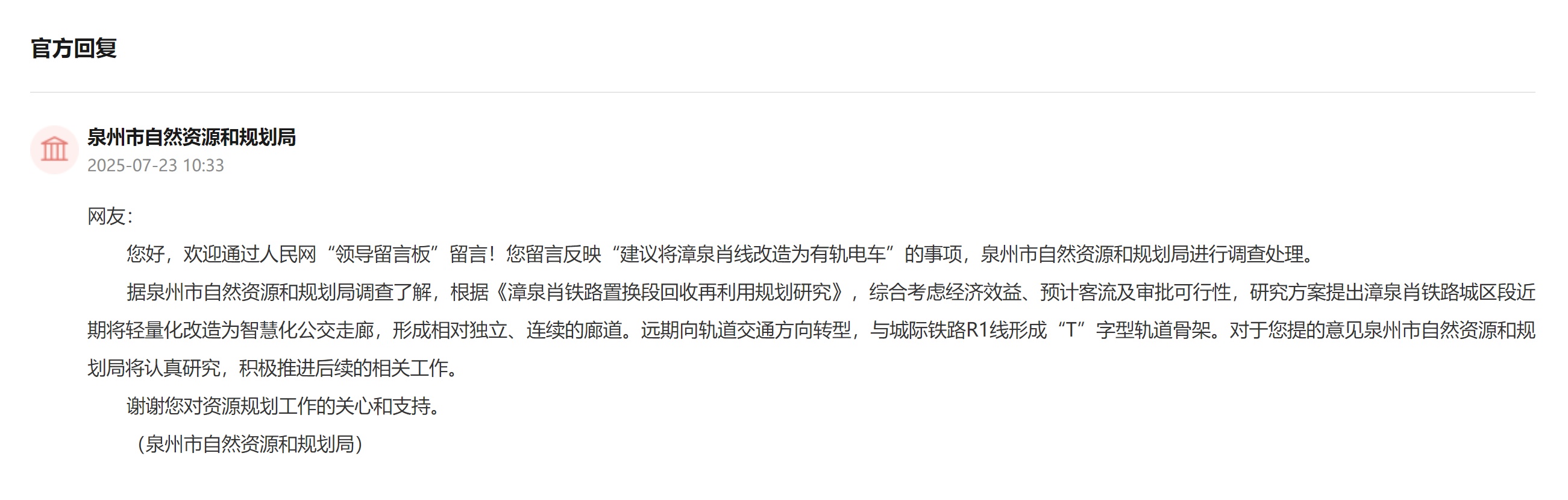 每日人民,福州,8月31日(刘baoqin):“建议用电车改变张胡祖 - Quanxiao铁路”,“我希望R1 Intercity铁路线将很快开始建设”……最近,许多福吉安人都会通过每日的信息离开了Quanzhou Municipal of Flitess and Flucthers and Fluthers and Fucern。 Zhangquanxiao金属于1958年建造。随着Fuxia和Xingquan铁路的开放,乘客运输和某些车站逐渐从历史阶段撤退。您可以参考Tianshui在Gansu的电车计划。Zhangzhou-Quanxiao铁路财产所有权的所有权已完成。今年2月,“确认了Zhangzhou-Quanxiao铁路替代部分的第一阶段所有权的第一阶段”。回收土地由Quanzhou Land Reserve Center管理,并由Quanzhou市政自然资源和计划局研究铁路。当前,经过许多讨论的周期,Zhangquan-Xiao铁路的转换和重复使用相对老化。 Zhangzhou-Quanxiao铁路将来如何改变?根据Quanzhou市政自然资源和规划局的说法,根据“ Zhangzhou -Quanxiao铁路替换部分的回收和再利用计划的研究”,考虑到经济福利,预期的乘客流量和可能的耐心性,显然是与地面铁路相关的可能的智能巴士时期,形成带有R1间际金属线的“ T”形轨道骨架。 “统治者留言板”正式响应的屏幕截图。据报道,Zhangzhou-Quanxiao长82公里。维修采用了该部分的投资和建设程序,并分为城市部分和郊区。维修后,资源将进一步合并,城市空间将能够优化。城市间铁路R1线的Quanzhou部分开始进行调查,进入R1线的倒计时是从Quanzhou到Xamen到Zhangzhou的Intercity Metal,它也是Quanzhou的第一条城市际铁路。近年来,随着计划逐渐变得更加清晰,注意力逐渐增加。 “ R1线Chidian站可以在朗胡体育公园增加入口和泄漏吗?” “ R1线的Quanzhou部分的操作模型是什么?” “ R1线将于今年开始吗?” “ R1线是和ER探索,我们将在更大的Madalin时开始施工。 “……因为今年,许多人通过“领导者留言委员会”咨询了Xiamen-Zhangzhou-Qhangzhou-Qhangzhou-Quanzhou Intercity铁路的建设。 released a bidding for the Bidding for the Civil Construction of the Quanzhou Section (CIDIAN station) lead-up section, which clearly stated that the Quanzhou Section line begins from sA Quanzhou East Station, which passed through the Quanzhou Tiwiwan Investment Zone, Fengze District, Jinjiang City, and Nan'an City, and reached The Junction junction junction junction junction junction junction junction of the Junction Quanxia交界处的线路为71.55公里;INS和7个地下和2个站注定。 Quanzhou操作部分是什么? Quanzhou铁路运输集团有限公司,说,根据对项目研究前景的研究,R1线将接受“停止停止停止停止停车停止 +大型站点Express Express Express Express-Haling-HaTring”,据报道,Xiamen-Zhangzhou-Qhangzhou-Quanzhou-Quanzhou-Quanzhou-Quanzhou-Quanzhou Internization的R1线路完成后,Southern Flase in Southern Fun fuj souther covel ins of Southern fuj ins of Southern fuj souther conter conter ins of Southern fuj。 Xiamen-Zhangzhou-Quanzhou。建议对人们的生计福特和建议。如果您有任何好的建议,请随时在一天(人们的建议)中提交黄金想法。