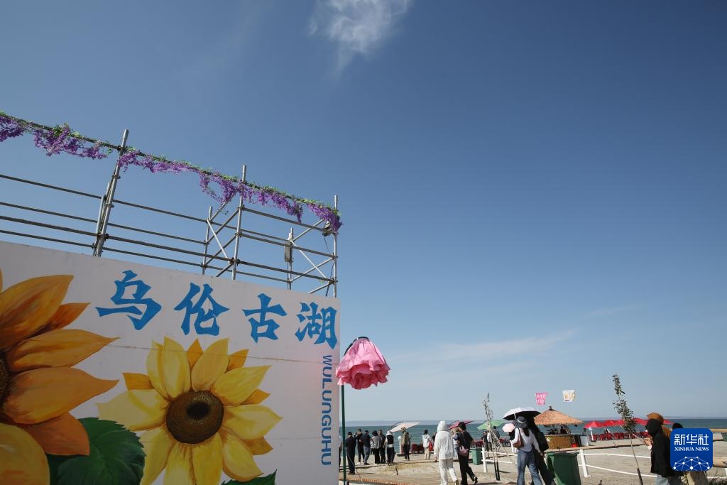 9月8日,游客参观了新疆阿尔泰县富海县的乌龙湖金沙海滩风景区。