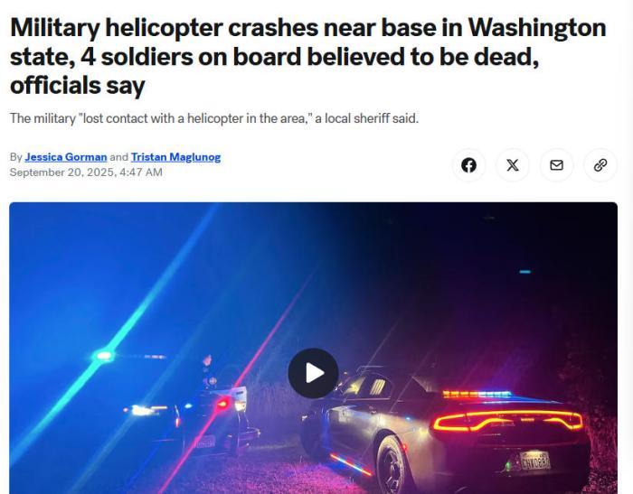 中国新闻社,9月20日。根据外国媒体报道,美国陆军特种作战司令部在9月19日当地时间证实,MH-60黑鹰直升机在华盛顿的刘易斯·麦科德联合基地附近倒塌,几天前,事故可能杀死四名士兵。图像来源:根据报道,美国军队报告的屏幕截图说,事故发生在直升机执行常规培训任务时的第17个当地时间。这架飞机带有四个人,与160的航空团特殊行动有关。据报道,事故原因仍在调查中。