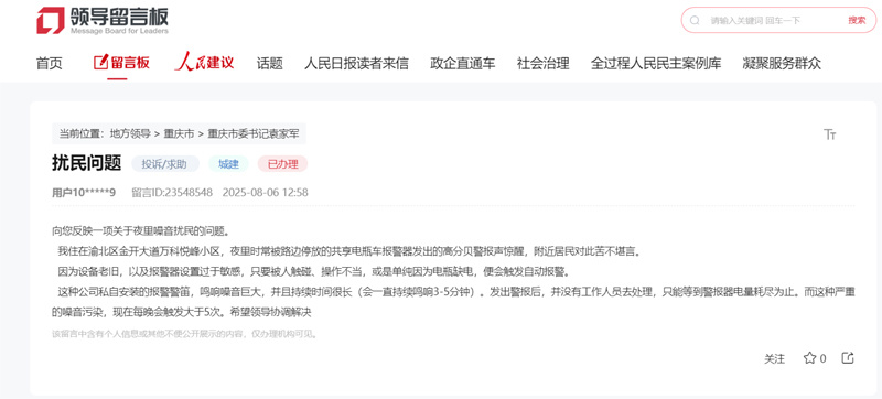 十天的重庆,8月31日(陈齐特):“晚上,我经常醒来电动汽车的警报,Mahjong Hall社区的噪音无法入睡。相关部门迅速访问并积极解决人们的问题。响应电池汽车警报中的强烈噪音:根据网民的全面调查和纠正,在Jinkai Avenue的Vanke Yuefeng社区附近的共享电池车上,Yubei区是由于旧设备和警报设置非常敏感的。它通常会在晚上激励警报,而且噪音压倒性,邻近的居民遭受了痛苦。此外,您的公元前还发生了一个问题,该问题在尤比地区的爱琴海购物中心的街道(Jinzhou Avenue)侧面发生。街道 - 共享自行车经常发行高频警报夜晚,并且持续很长时间,严重干扰了居民的正常生活。单击以查看消息和响应详细信息。雷恩街(Renhe Street),Liangjiang New District和Jinshan Street,Liangjiang New District分别做出了回应。为了回应公开分散网民的夜间噪音,相关部门开始进行调查和验证。他们将尽快与共享电池操作员联系,并要求他们进行全面的调查,鼓励企业优化警报参数,缩短声音时间,并建立紧急响应之夜的机制,以减少对其余周围居民的影响。同时,业务区管理还将与业务区管理合作,以标准化车辆的停车,以减少不正确联系的可能性。为了回应许多共享自行车停放在Yubei Distri的爱琴海购物中心街上的问题CT(Jinzhou Avenue)和警报在夜间发出,在发现警报原因之后,将来将在将来采取以下步骤:更改电池时间,取消,取消该停车场以及刺穿。对社区的回应,打开一个大厅来打扰公众:标准化业务行为以避免公众中断,有人在社区中开设了一个Mahjong Hall,Yutai Jiayan,第8大楼,没有。重庆98 Gaoxiang Avenue。自今年7月以来,Mahjong Hall不仅在白天继续运作,而且在22:00天后没有停止运行。在这段时间里,大洪(Mahjong)引起的“爆炸”声音和人们对周围居民剩下的夜晚的强烈说法,使居民难以正常睡眠,并极大地影响了生活质量。单击以查看消息和响应详细信息。作为回应,汉纳镇回答,重庆高科技区AF验证,情况确实如此。 Ping在8月12日至17日下午22点到达了一个全面的管理帖子和综合巡逻队。除了8月12日下午22点之后的私人房间玩Mahjong外,居民在其他时候在这里聊天。员工向经营者提供了法律教育,并要求他们强烈控制自己的工作时间并稳定其业务行为,以避免中断人们。将来,汉古镇将继续增加Mahjong Hall的管理,加强太阳至日检查和积极的鼓励,并有效地保护社区居民的合法权利和利益。 (实习生吉亚·曼(Jia Man)参加面试和写作)记住人民的井井有条。您是否有需要轻松解决的问题?欢迎来到人们的每日“领导邮件委员会”,以谈论您的困难和担忧。